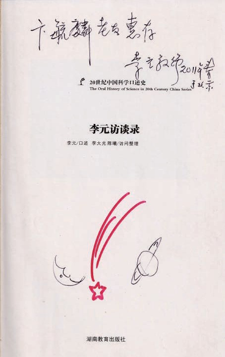 图1 李元亲笔签赠笔者的《李元访谈录》扉页书影,他自绘的Logo非常有特色:拟人化的月亮、彗星和土星