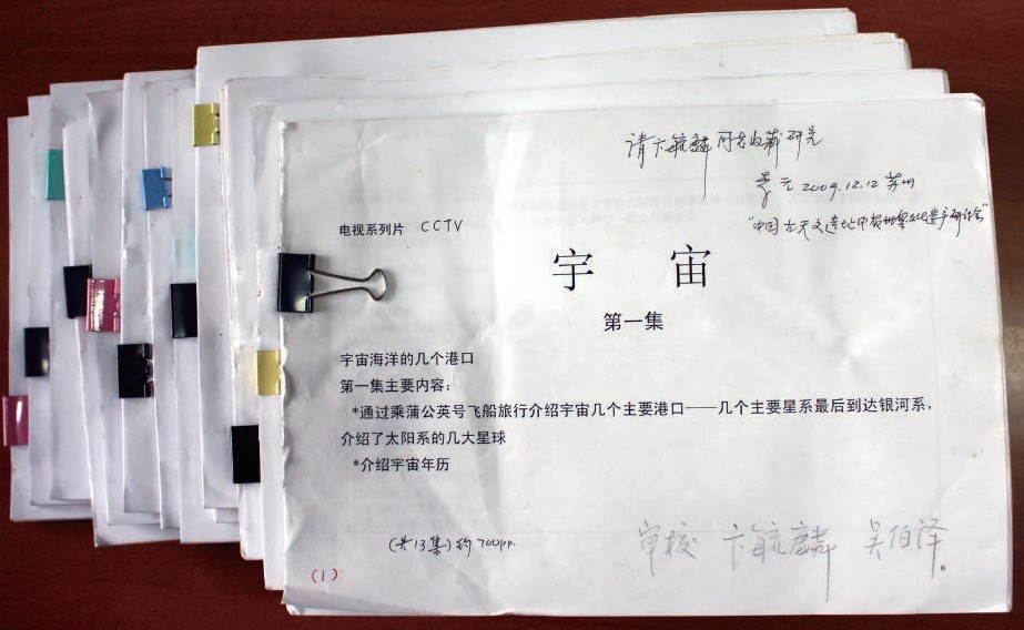 图2 电视系列片《宇宙》的中译脚本打字稿,透视效果使下层纸张尺寸显得小了许多,可见这摞稿子有多厚