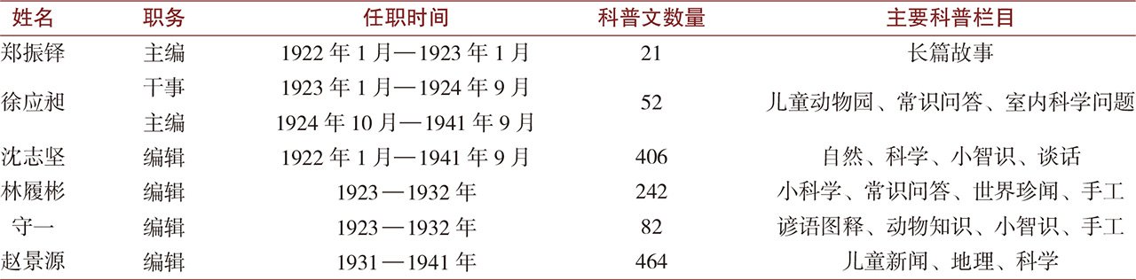 在《儿童世界》的核心团队中,郑振铎与徐应昶两位主编分别引领了期刊的不同发展阶段,而沈志坚、林履彬、守一、赵景源等编辑则是推动科学传播实践的重要行动者。他们肩负编辑与创作者双重角色,通过协同的工作模式,促进《儿童世界》对科学知识的创新传播。