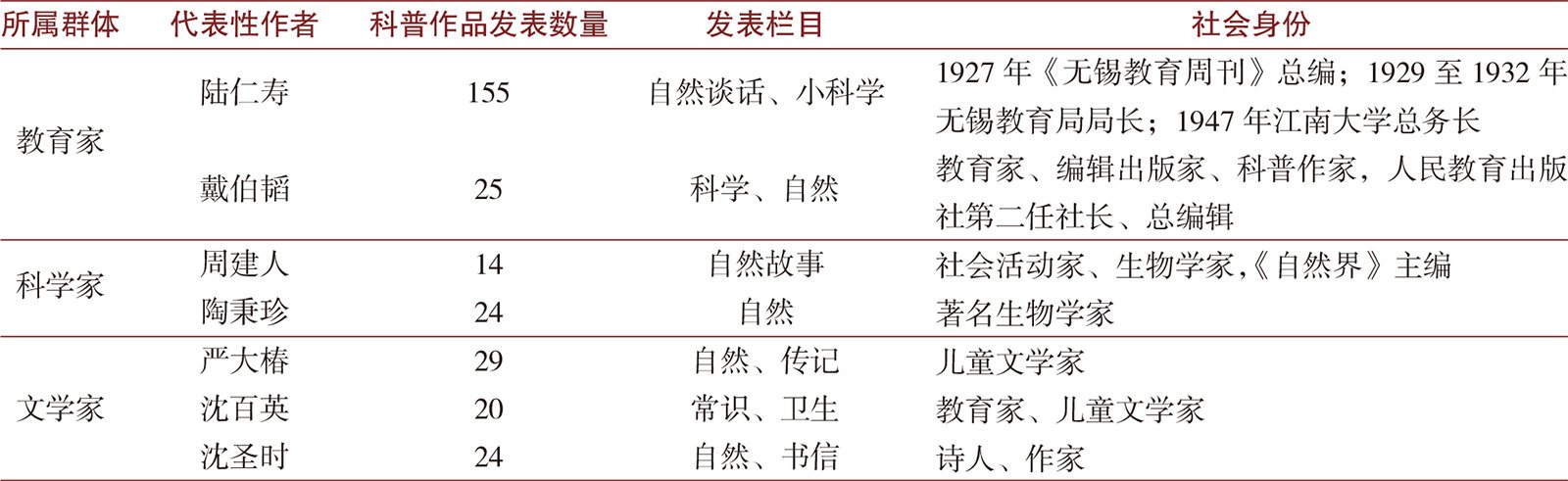 除主编与编辑团队外,在《儿童世界》发表科普作品数量较高的主要是教育家、科学家、文学家3个群体,其中代表性作者(表2)扮演着基础性角色。这些创作者通过其独特的知识结构与叙事手法,共同构建了一个面向儿童的,融合科学与艺术、理论与实践的知识交流网络。