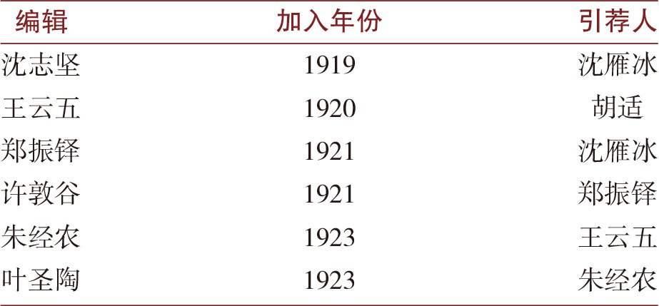业缘关系作为个体主动构建的关键社会资本,彰显了个人在社会互动中的主体性与适应性。在《儿童世界》编辑团队内部,存在清晰的职业传承与提携脉络。王云五与朱经农、叶圣陶与严大椿、沈雁冰与孙毓修等基于出版事业或教育背景形成的师生或提携关系,本身就构成了业缘网络的重要节点,促进了专业经验与理念的传递。更重要的是,团队成员的吸纳与现有员工基于专业认同与人际信任的内部推荐密切相关(表3)。一方面,在编创团队中,由沈雁冰引荐来的郑振铎,很快也引荐许敦谷到商务印书馆,生动体现了这种基于业缘关系的协作模式。特别是郑振铎兼具加入者与引荐者的双重身份,在业缘网络中发挥着桥梁作用。这种推荐机制不仅为个人提供了职业发展机会,更有效地促进了编辑理念、专业知识和实践经验的流通与共享,是维系团队稳定性和保障期刊编辑方针连贯性的关键。另一方面,商务印书馆的组织架构与高层管理,为《儿童世界》构筑了更具支撑性的业缘网络基础。编译所所长王云五主导了编译所的改革与运作,其自身也是通过胡适引荐加入商务印书馆的核心人物。同时,王云五引荐朱经农加入商务印书馆,而朱经农随后凭借其丰富的教育背景和人脉资源,识别并引荐了叶圣陶。这种依托于编译所管理层的人才识别与引荐链条,拓展了编创团队的人才来源,体现了业缘网络在组织层面进行人才整合与资源配置的效能。