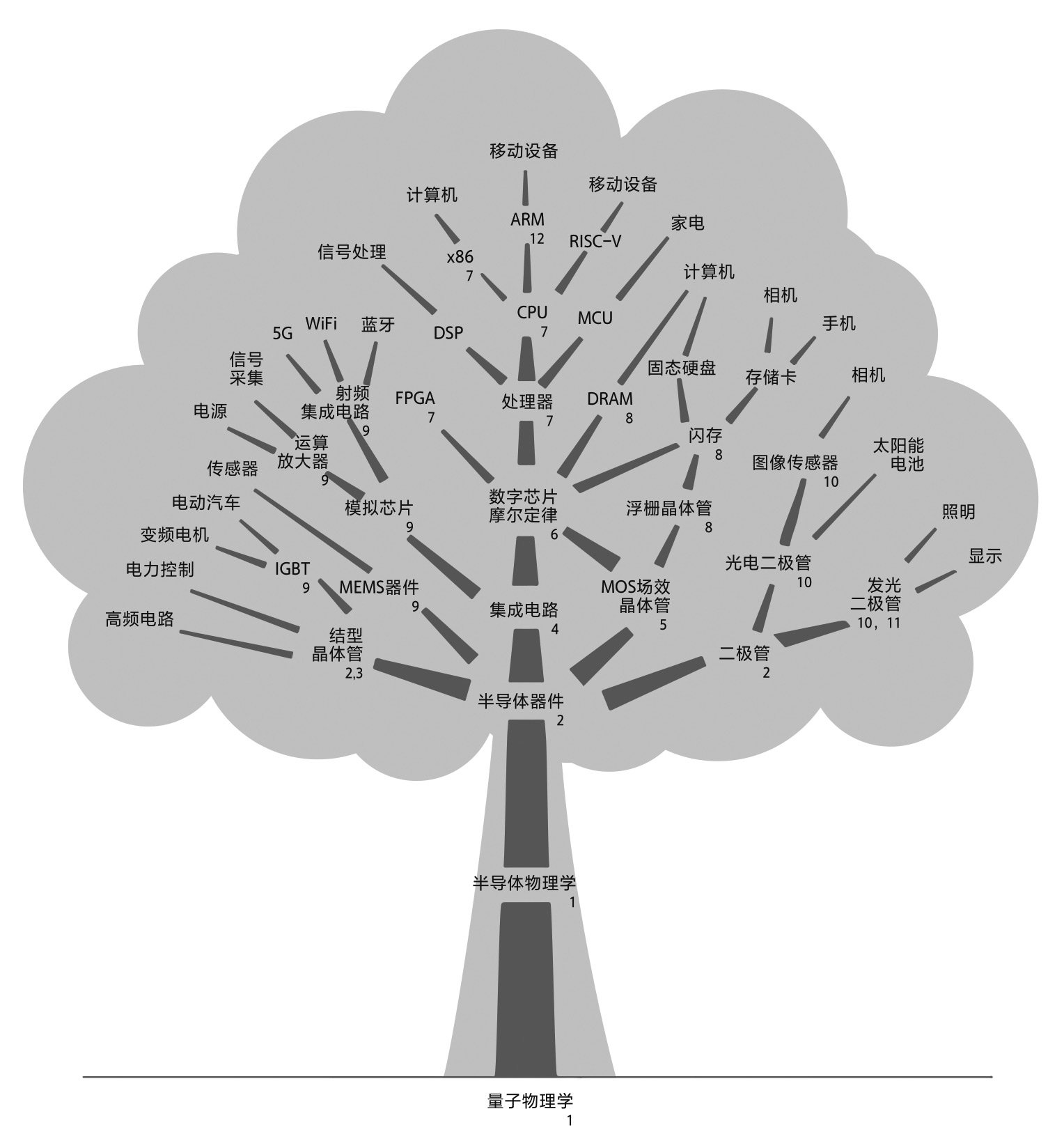 提起芯片,许多人的脑海中都会浮现一块方方正正、体积小巧的黑色薄片,外观科技感十足,上面用金属焊接了密密麻麻的管脚……这完全符合公众对现代芯片的印象,但也仅限于“现代”。假如沿着时间轴回溯几十年,人们会惊讶地发现,芯片的最初形态和现在存在天壤之别,甚至不能称之为“片”,而是一些形状各异、体积较大的真空管。这也是《芯片简史》的故事为何要从半导体技术讲起的原因。饮水必思源,要追溯芯片的发展,先要回顾它的前身——半导体器件。从简到繁的半导体器件,像一颗发芽的种子,演化出了双极型晶体管、MOS场效应晶体管①、光电二极管等产物,又由此集成构造出了模拟芯片、数字芯片和光电芯片。这一体系如同大树的树杈层层向外延伸(图2),人们所了解的,或者说印象中的芯片,其实只是参天大树的枝叶一隅。